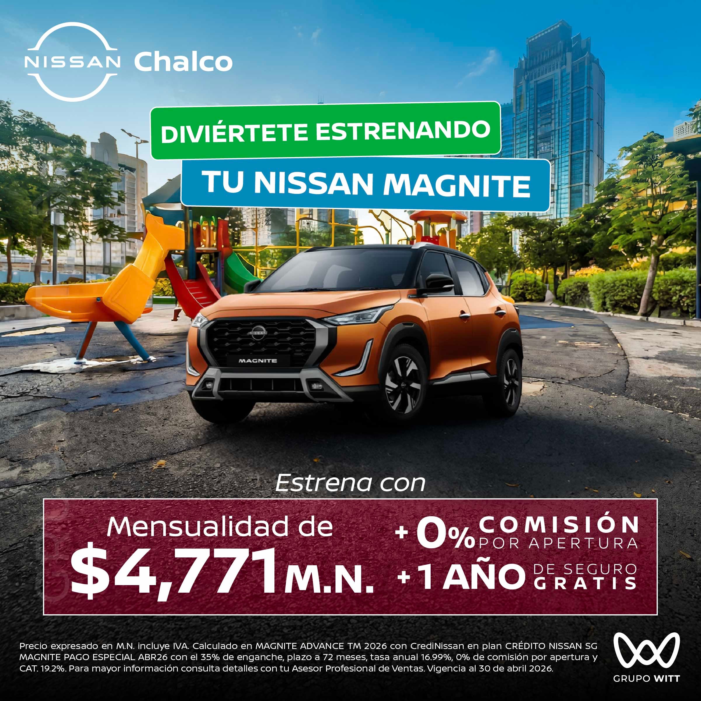 Precio expresado en M.N. incluye IVA. Calculado en MAGNITE ADVANCE TM 2026 con CrediNissan en plan CRÉDITO NISSAN SG MAGNITE PAGO ESPECIAL ABR26 con el 35% de enganche, plazo a 72 meses, tasa anual 16.99%, 0% de comisión por apertura y CAT. 19.2%. Para mayor información consulta detalles con tu Asesor Profesional de Ventas. Vigencia al 30 de abril 2026.