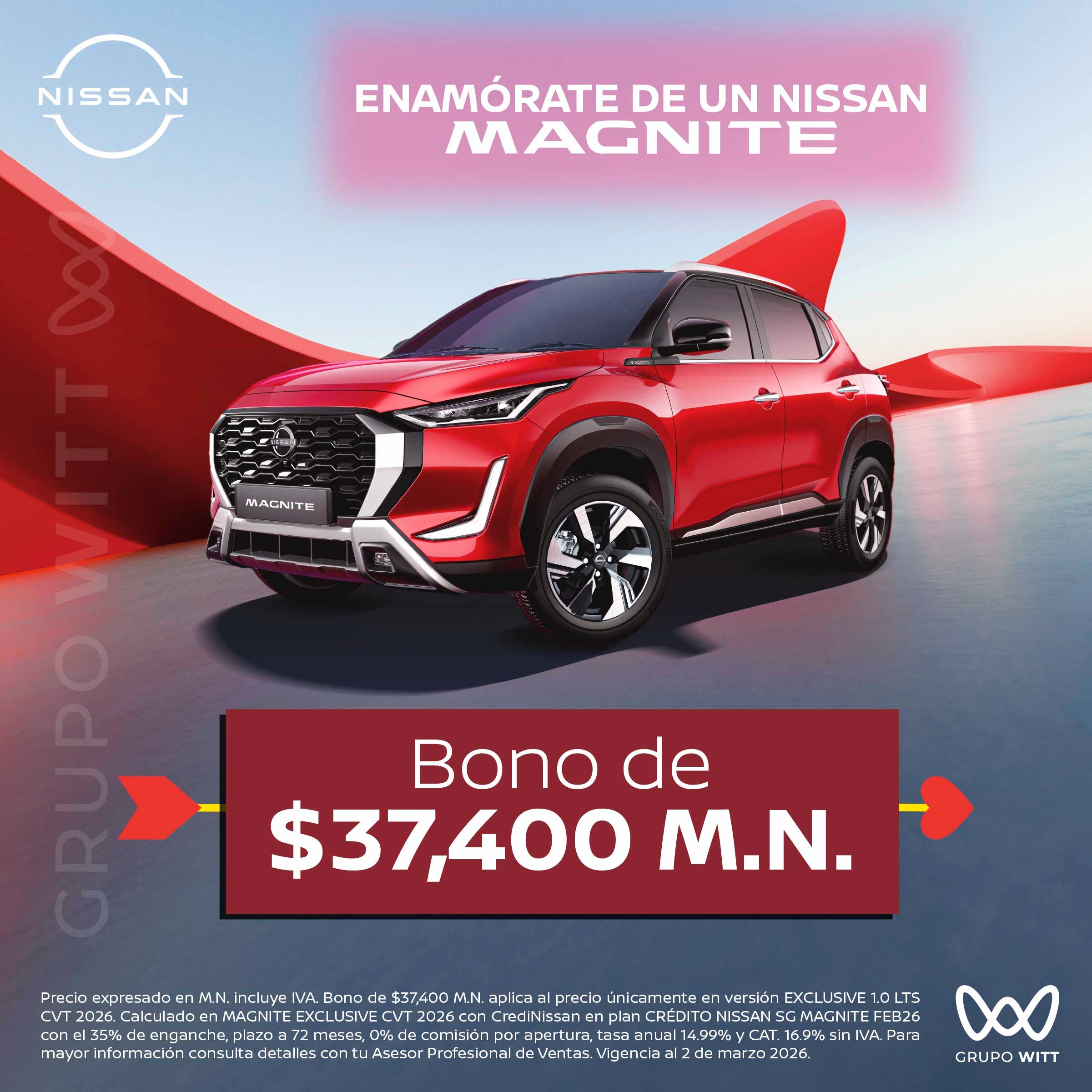 Precio expresado en M.N. incluye IVA. Bono de $37,400 M.N. aplica al precio únicamente en versión EXCLUSIVE 1.0 LTS CVT 2026. Calculado en MAGNITE EXCLUSIVE CVT 2026 con CrediNissan en plan CRÉDITO NISSAN SG MAGNITE FEB26 con el 35% de enganche, plazo a 72 meses, 0% de comisión por apertura, tasa anual 14.99% y CAT. 16.9% sin IVA. Para mayor información consulta detalles con tu Asesor Profesional de Ventas. Vigencia al 2 de marzo 2026.
