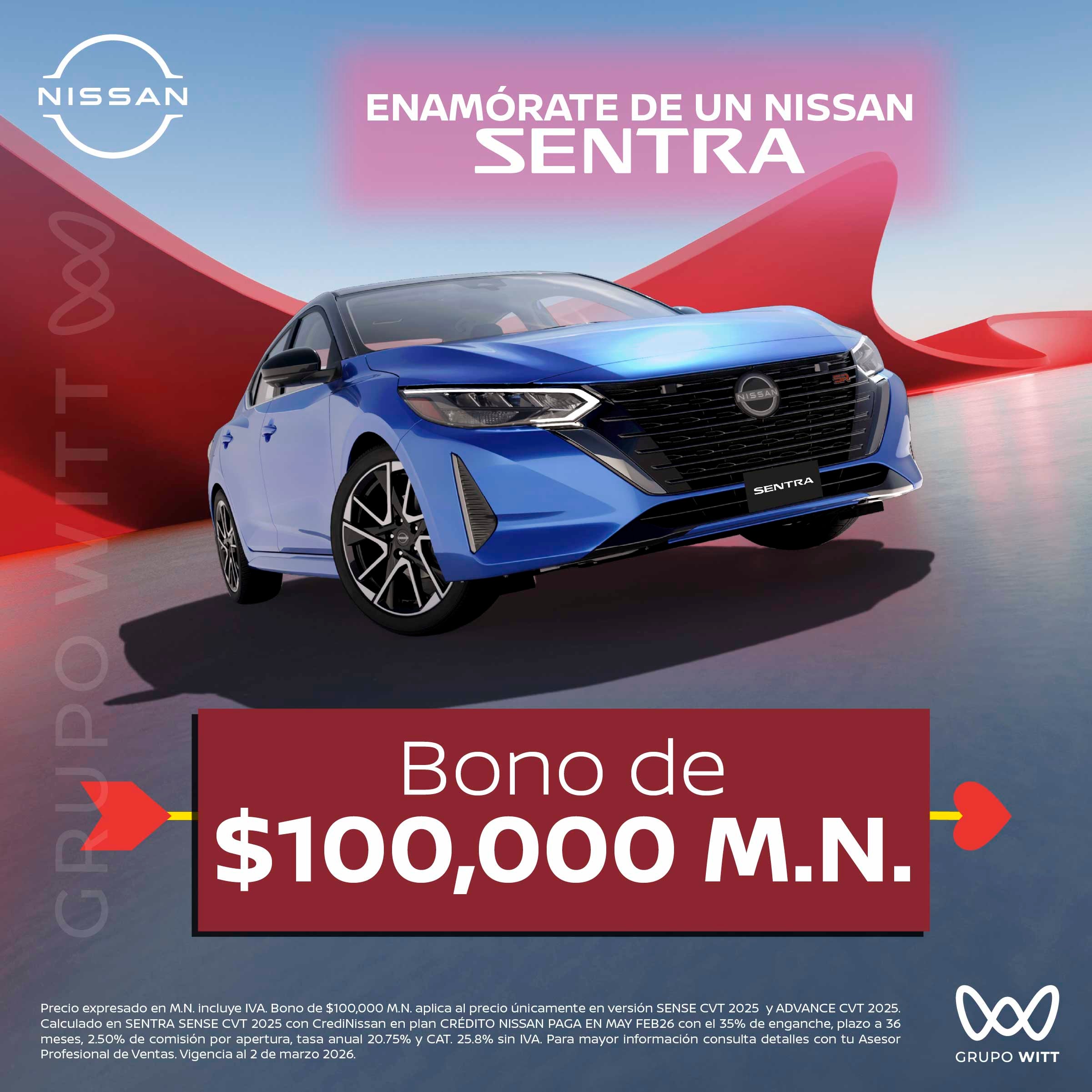 Precio expresado en M.N. incluye IVA. Bono de $100,000 M.N. aplica al precio únicamente en versión SENSE CVT 2025 y ADVANCE CVT 2025. Calculado en SENTRA SENSE CVT 2025 con CrediNissan en plan CRÉDITO NISSAN PAGA EN MAY FEB26 con el 35% de enganche, plazo a 36 meses, 2.50% de comisión por apertura, tasa anual 20.75% y CAT. 25.8% sin IVA. Para mayor información consulta detalles con tu Asesor Profesional de Ventas. Vigencia al 2 de marzo 2026.