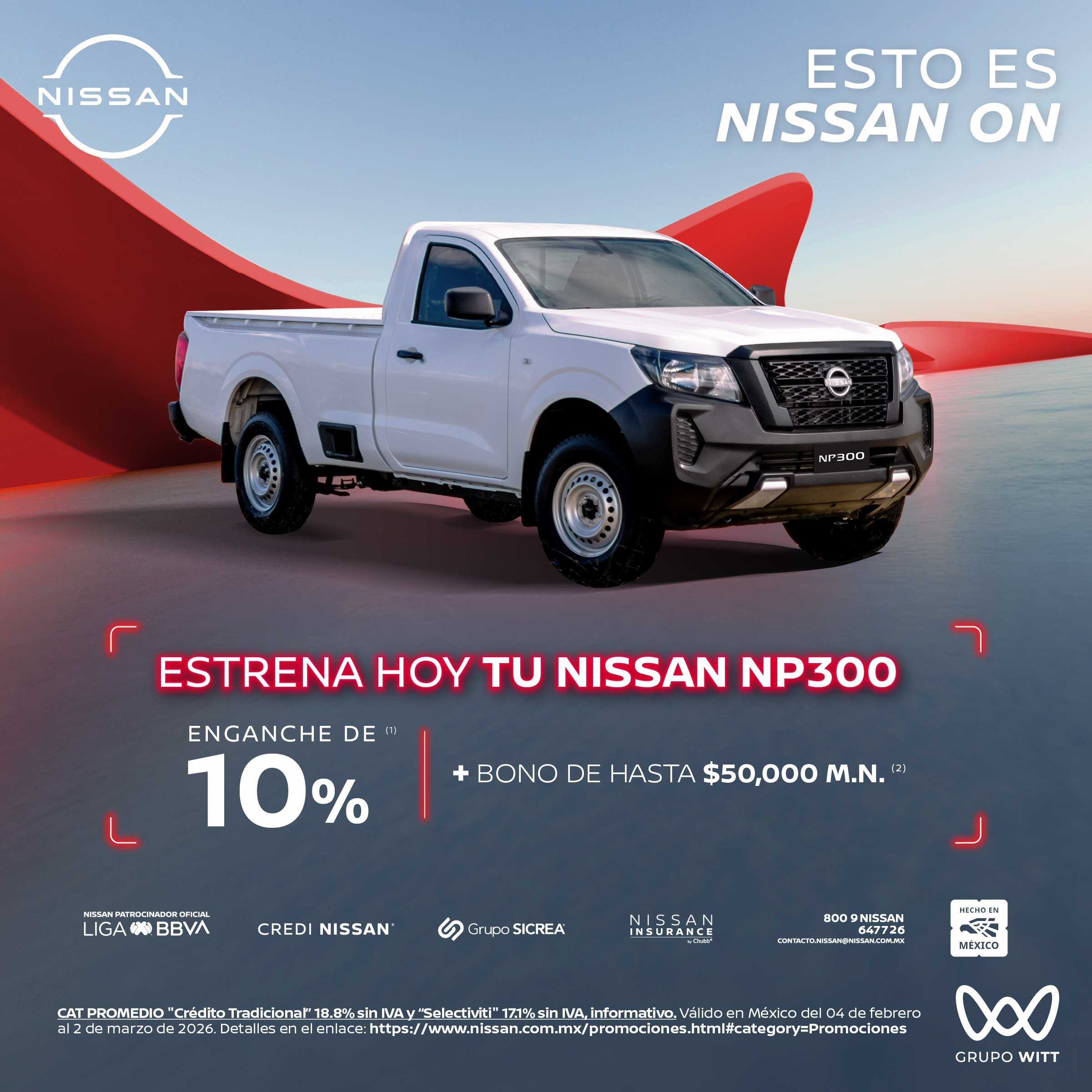CAT PROMEDIO "Crédito Tradicional" 18.8% sin IVA y "Selectiviti" 17.1% sin IVA, informativo. Válido en México del 04 de febrero al 2 de marzo de 2026. Detalles en el enlace: https://www.nissan.com.mx/promociones.html#category=Promociones