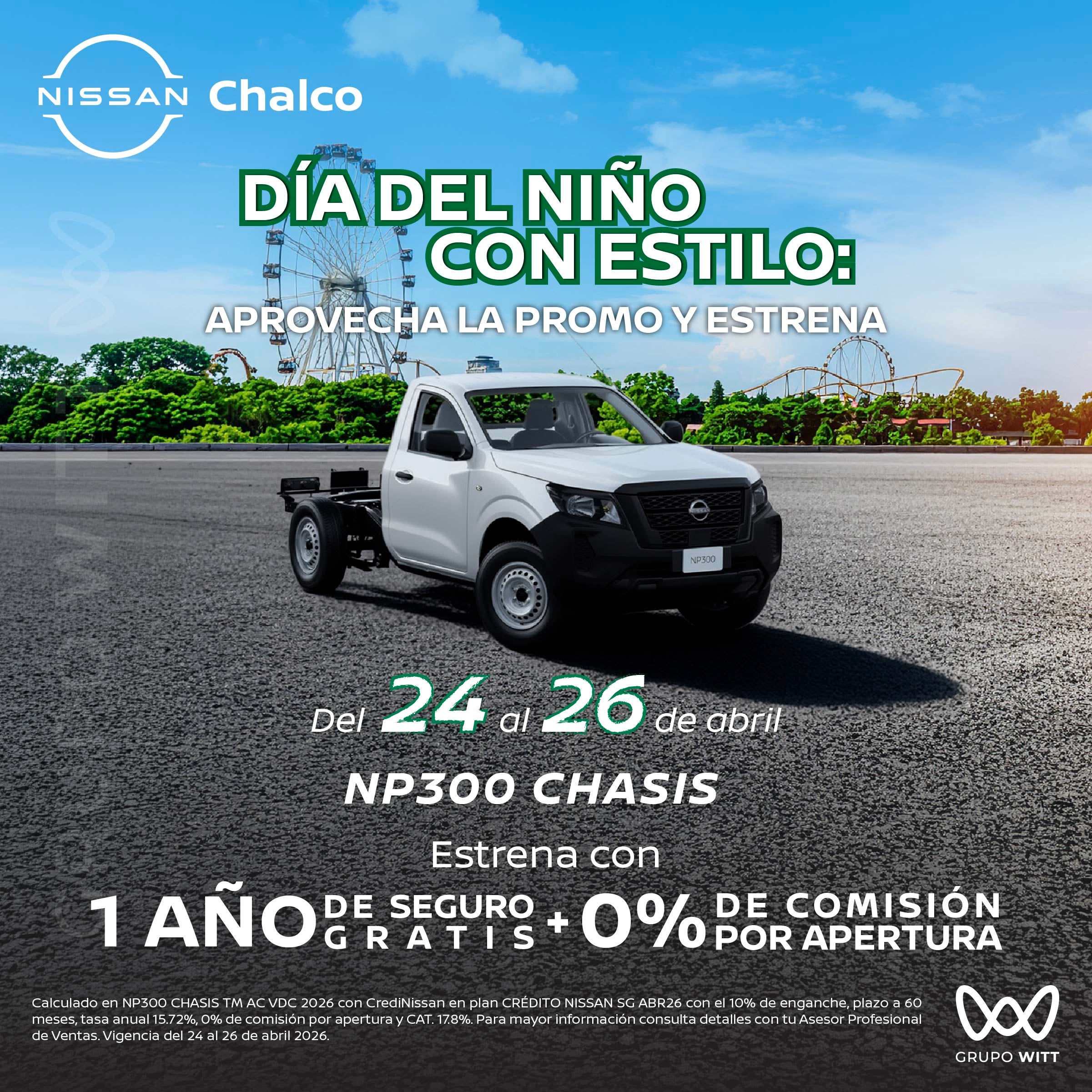 Calculado en NP300 CHASIS TM AC VDC 2026 con CrediNissan en plan CRÉDITO NISSAN SG ABR26 con el 10% de enganche, plazo a 60 meses, tasa anual 15.72%, 0% de comisión por apertura y CAT. 17.8%. Para mayor información consulta detalles con tu Asesor Profesional de Ventas. Vigencia del 24 al 26 de abril 2026.