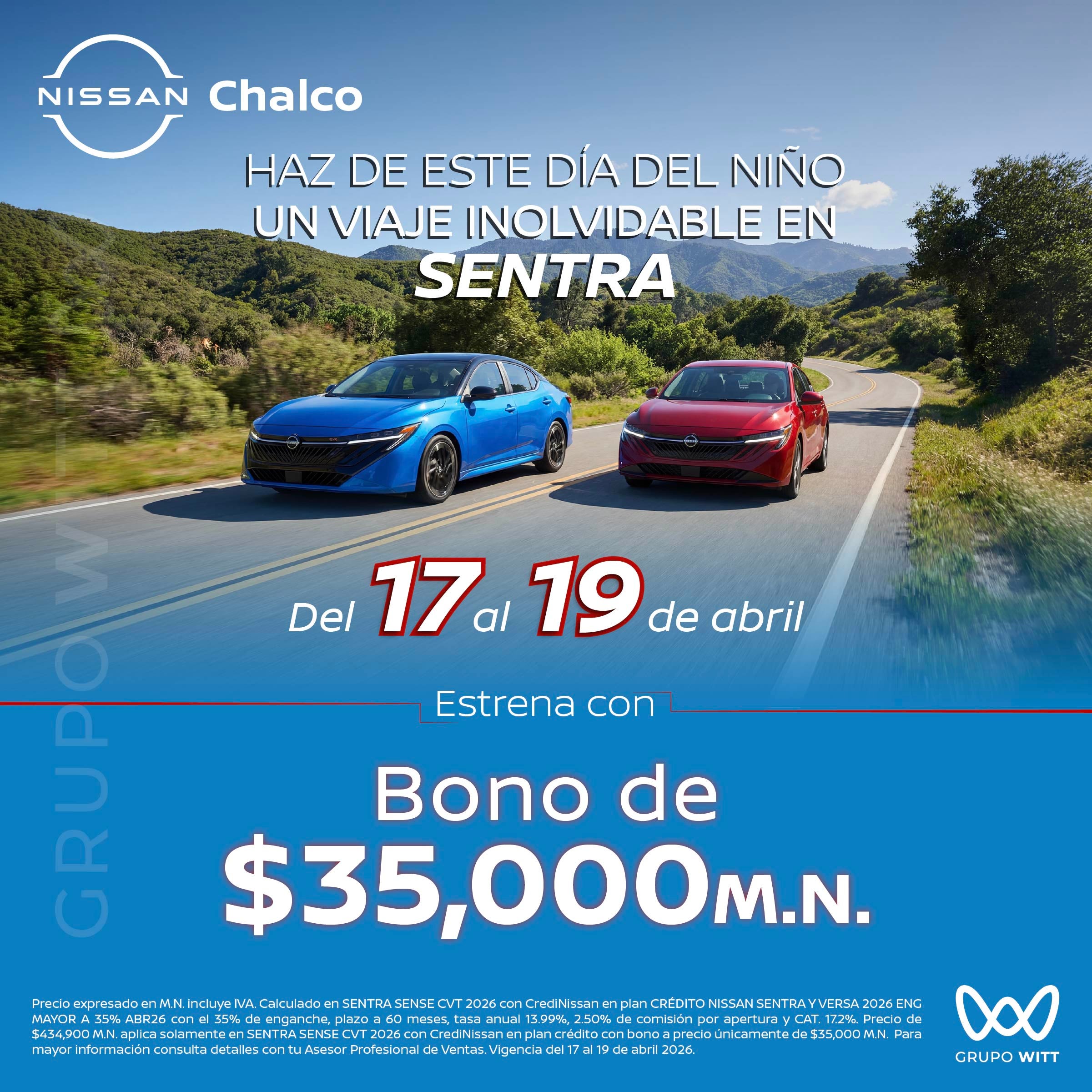 Precio expresado en M.N. incluye IVA. Calculado en SENTRA SENSE CVT 2026 con CrediNissan en plan CRÉDITO NISSAN SENTRA Y VERSA 2026 ENG MAYOR A 35% ABR26 con el 35% de enganche, plazo a 60 meses, tasa anual 13.99%, 2.50% de comisión por apertura y CAT. 17.2%. Precio de $434,900 M.N. aplica solamente en SENTRA SENSE CVT 2026 con CrediNissan en plan crédito con bono a precio únicamente de $35,000 M.N. Para mayor información consulta detalles con tu Asesor Profesional de Ventas. Vigencia del 17 al 19 de abril 2026.