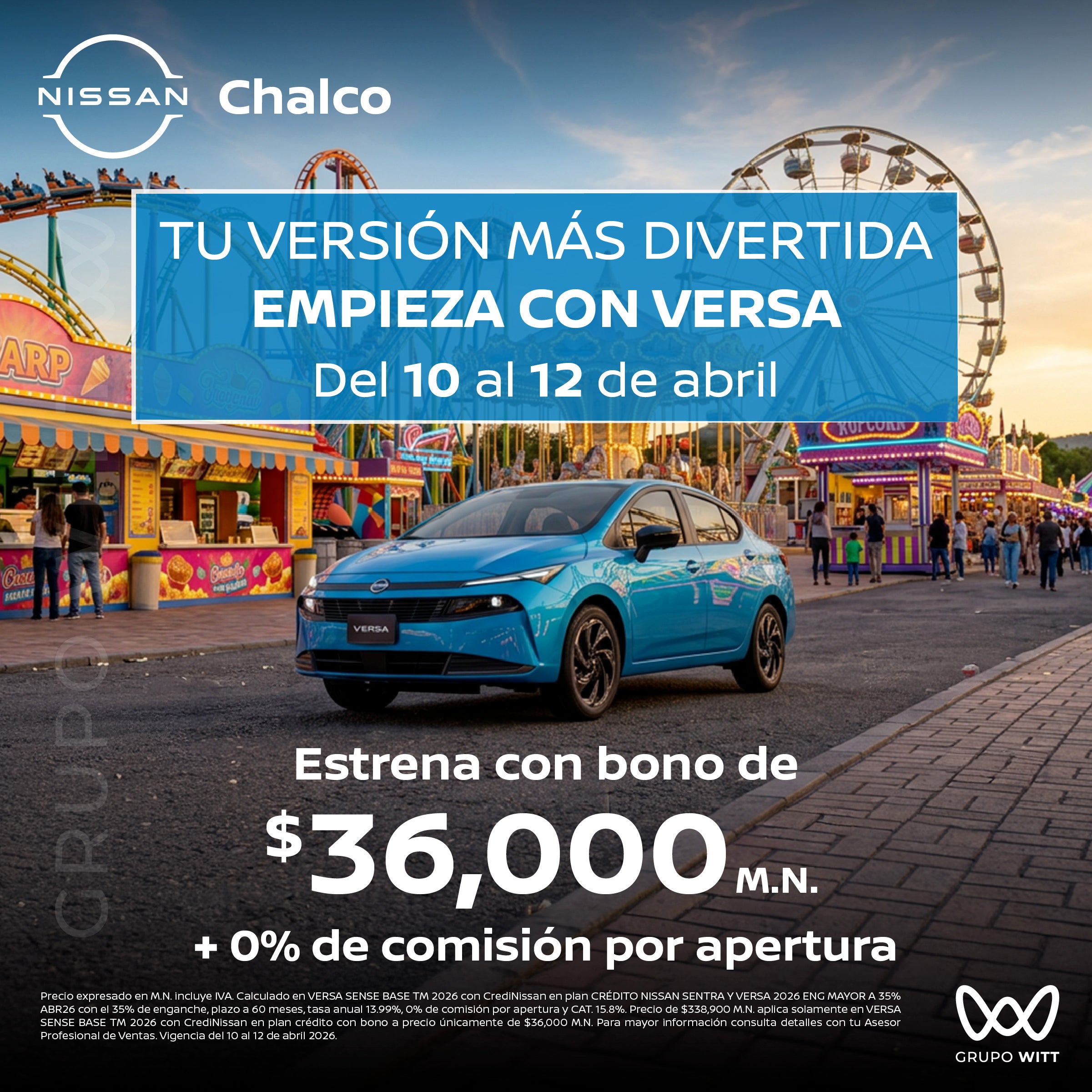 Precio expresado en M.N. incluye IVA. Calculado en VERSA SENSE BASE TM 2026 con CrediNissan en plan CRÉDITO NISSAN SENTRA Y VERSA 2026 ENG MAYOR A 35% ABR26 con el 35% de enganche, plazo a 60 meses, tasa anual 13.99%, 0% de comisión por apertura y CAT. 15.8%. Precio de $338,900 M.N. aplica solamente en VERSA SENSE BASE TM 2026 con CrediNissan en plan crédito con bono a precio únicamente de $36,000 M.N. Para mayor información consulta detalles con tu Asesor Profesional de Ventas. Vigencia del 10 al 12 de abril 2026.
