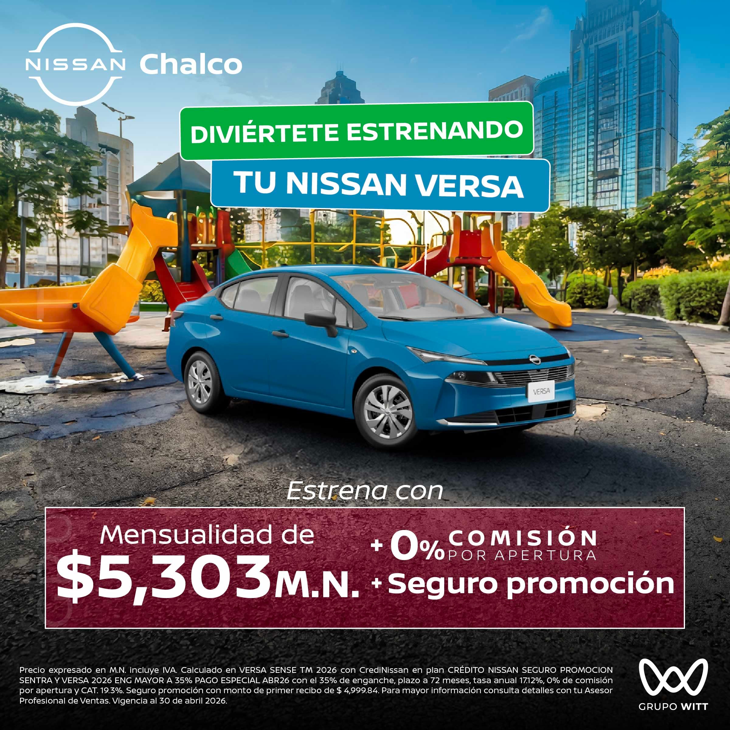 Precio expresado en M.N. incluye IVA. Calculado en VERSA SENSE TM 2026 con CrediNissan en plan CRÉDITO NISSAN SEGURO PROMOCION SENTRA Y VERSA 2026 ENG MAYOR A 35% PAGO ESPECIAL ABR26 con el 35% de enganche, plazo a 72 meses, tasa anual 17.12%, 0% de comisión por apertura y CAT. 19.3%. Seguro promoción con monto de primer recibo de $ 4,999.84. Para mayor información consulta detalles con tu Asesor Profesional de Ventas. Vigencia al 30 de abril 2026.