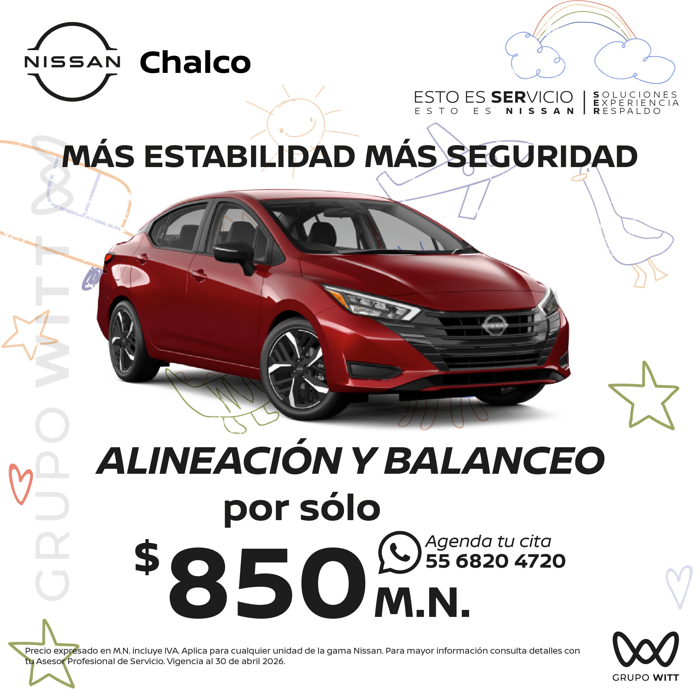 Precio expresado en M.N. incluye IVA. Aplica para cualquier unidad de la gama Nissan. Para mayor información consulta detalles con tu Asesor Profesional de Servicio. Vigencia al 30 de abril 2026.