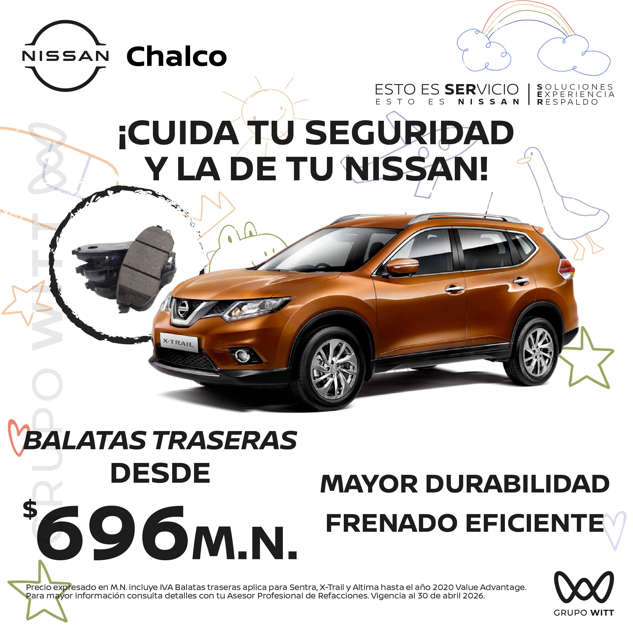 Precio expresado en M.N. incluye IVA Balatas traseras aplica para Sentra, X-Trail y Altima hasta el año 2020 Value Advantage. Para mayor información consulta detalles con tu Asesor Profesional de Refacciones. Vigencia al 30 de abril 2026.