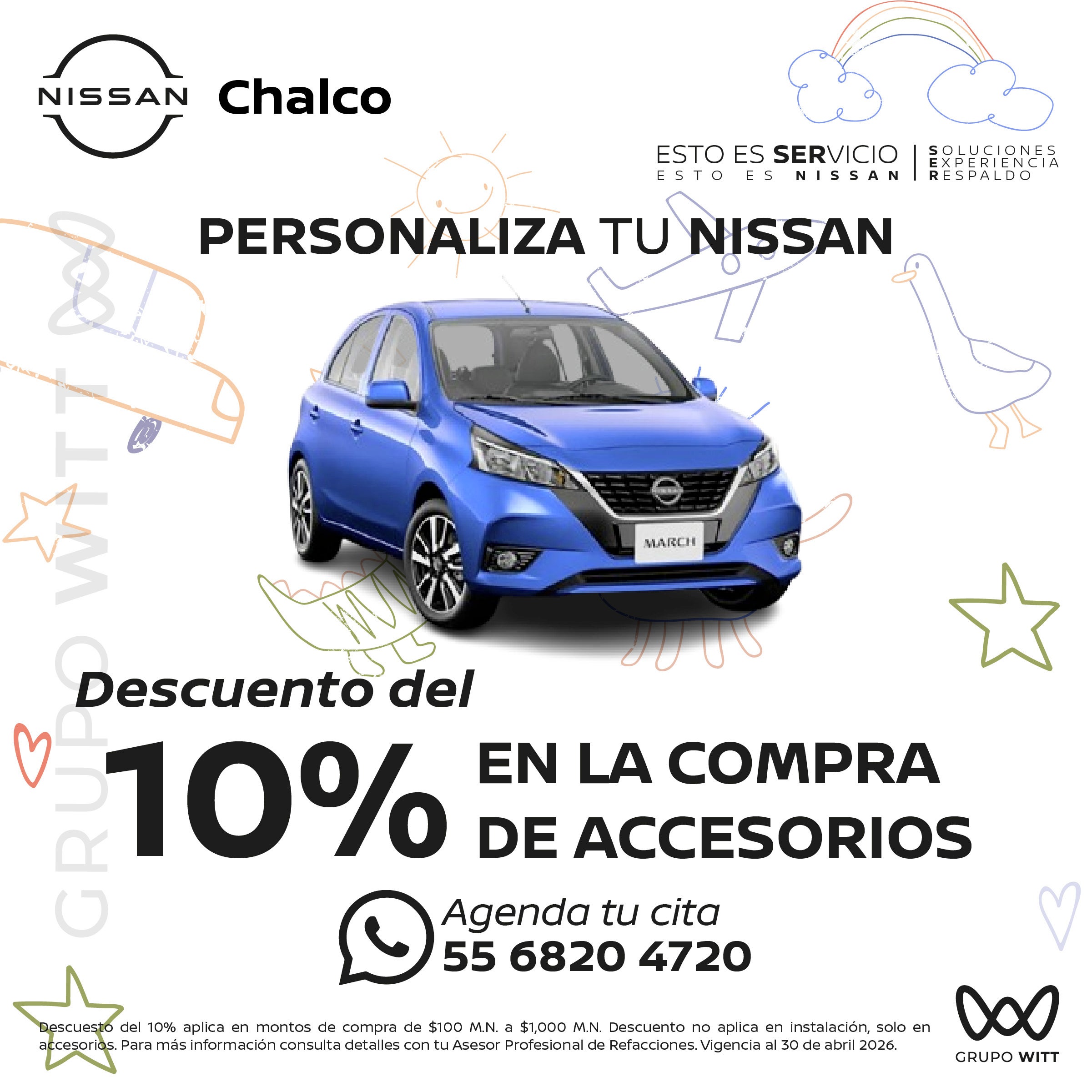 Descuesto del 10% aplica en montos de compra de $100 M.N. a $1,000 M.N. Descuento no aplica en instalación, solo en accesorios. Para más información consulta detalles con tu Asesor Profesional de Refacciones. Vigencia al 30 de abril 2026.