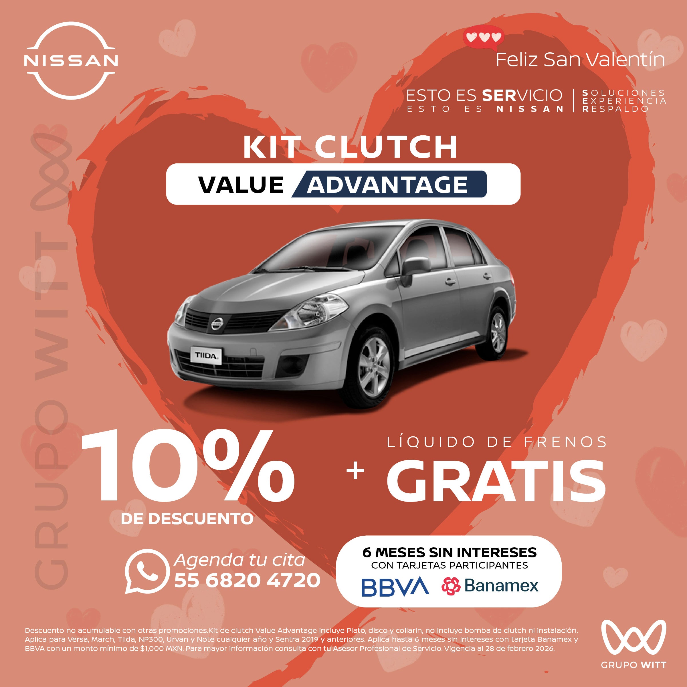Descuento no acumulable con otras promociones. Kit de clutch Value Advantage incluye Plato, disco y collarín, no incluye bomba de clutch ni instalación. Aplica para Versa, March, Tiida, NP300, Urvan y Note cualquier ano y Sentra 2019 y anteriores. Aplica hasta 6 meses sin intereses con tarjeta Banamex y BBVA con un monto mínimo de $1,000 MXN. Para mayor información consulta con tu Asesor Profesional de Servicio. Vigencia al 28 de febrero 2026.
