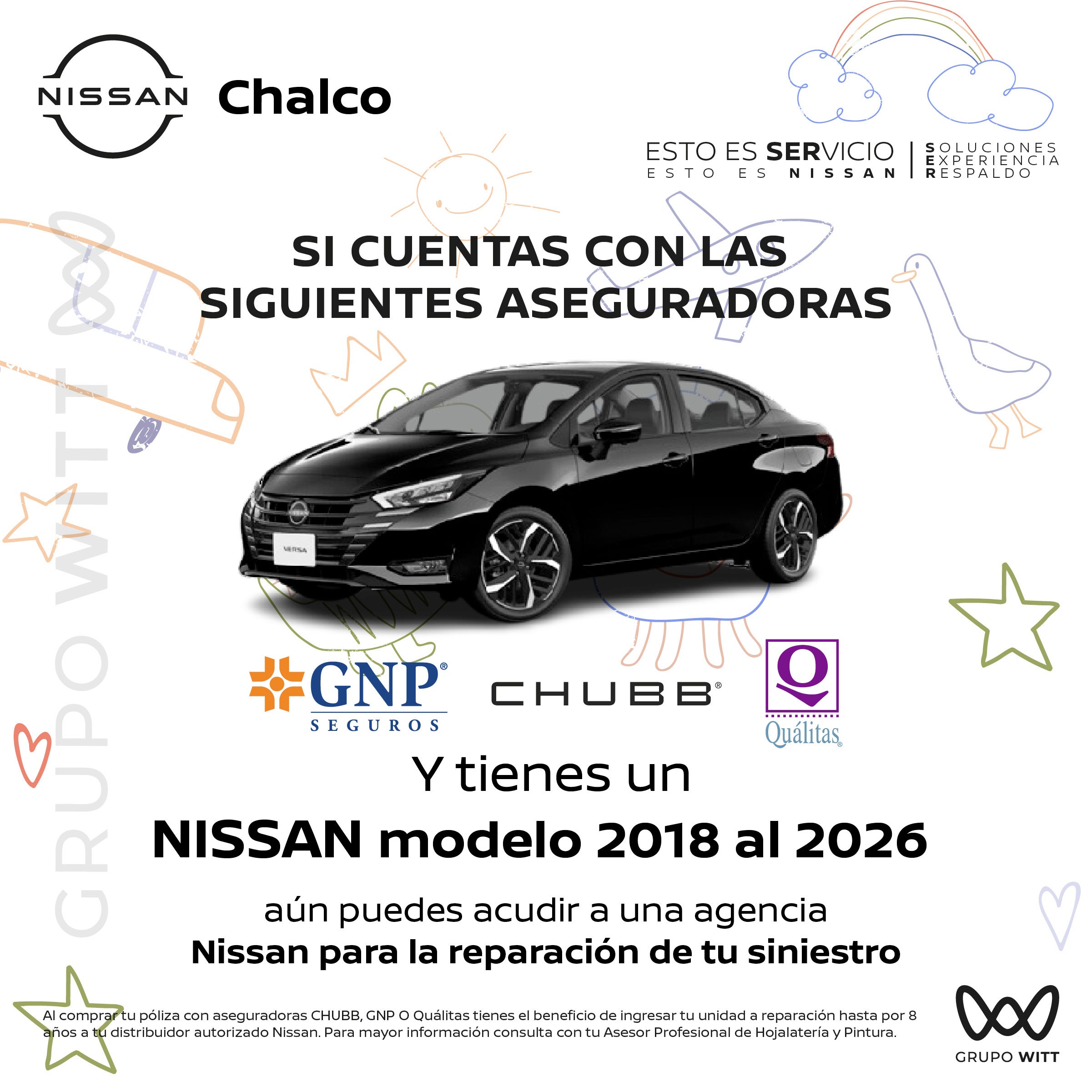 Al comprar tu póliza con aseguradoras CHUBB, GNP O Quálitas tienes el beneficio de ingresar tu unidad a reparación hasta por 8 años a tu distribuidor autorizado Nissan. Para mayor información consulta con tu Asesor Profesional de Hojalatería y Pintura.