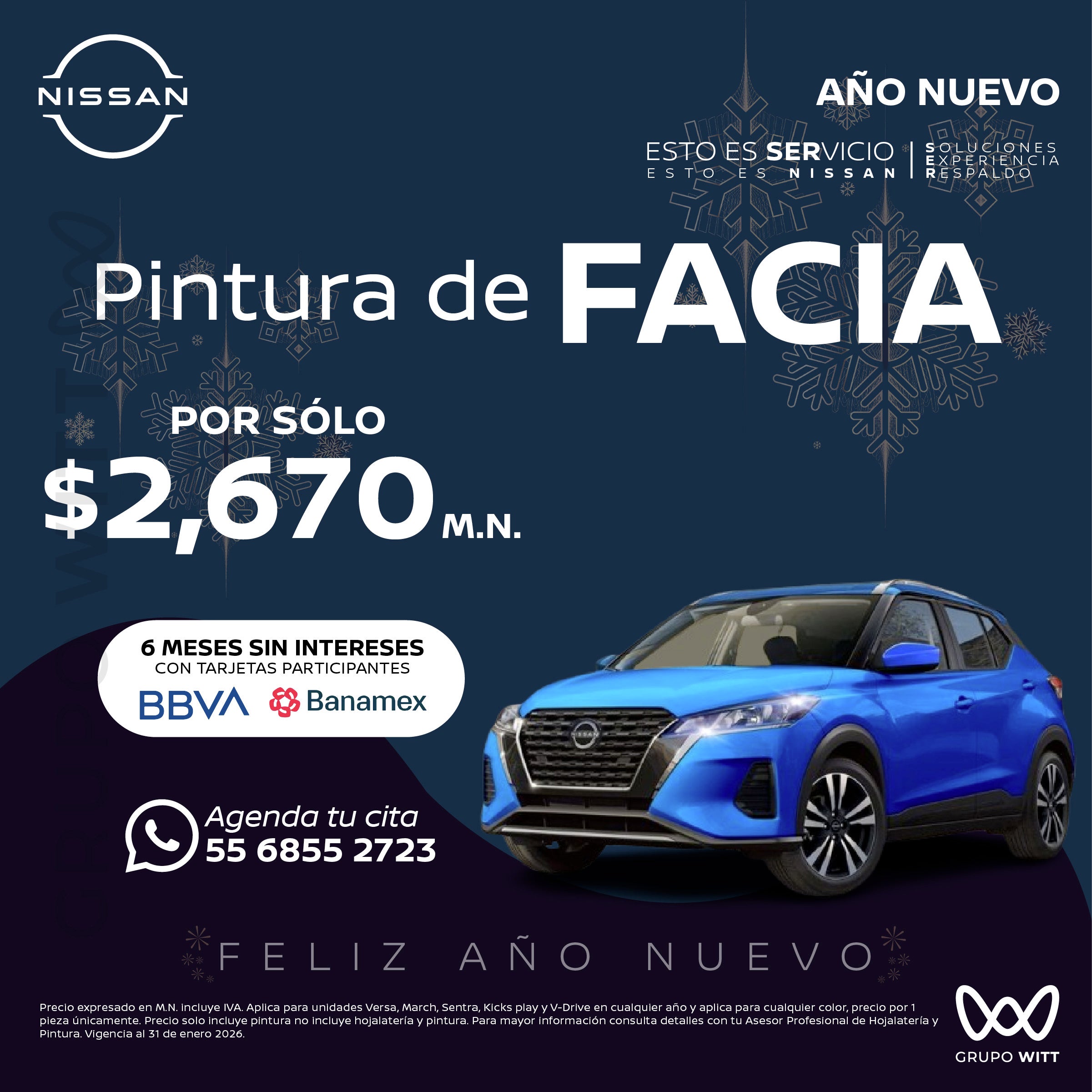 Precio expresado en M.N. incluye IVA. Aplica para unidades Versa, March, Sentra, Kicks play y V-Drive en cualquier ano y aplica para cualquier color, precio por 1 pieza únicamente. Precio solo incluye pintura no incluye hojalatería y pintura. Para mayor información consulta detalles con tu Asesor Profesional de Hojalatería y Pintura. Vigencia al 31 de enero 2026.