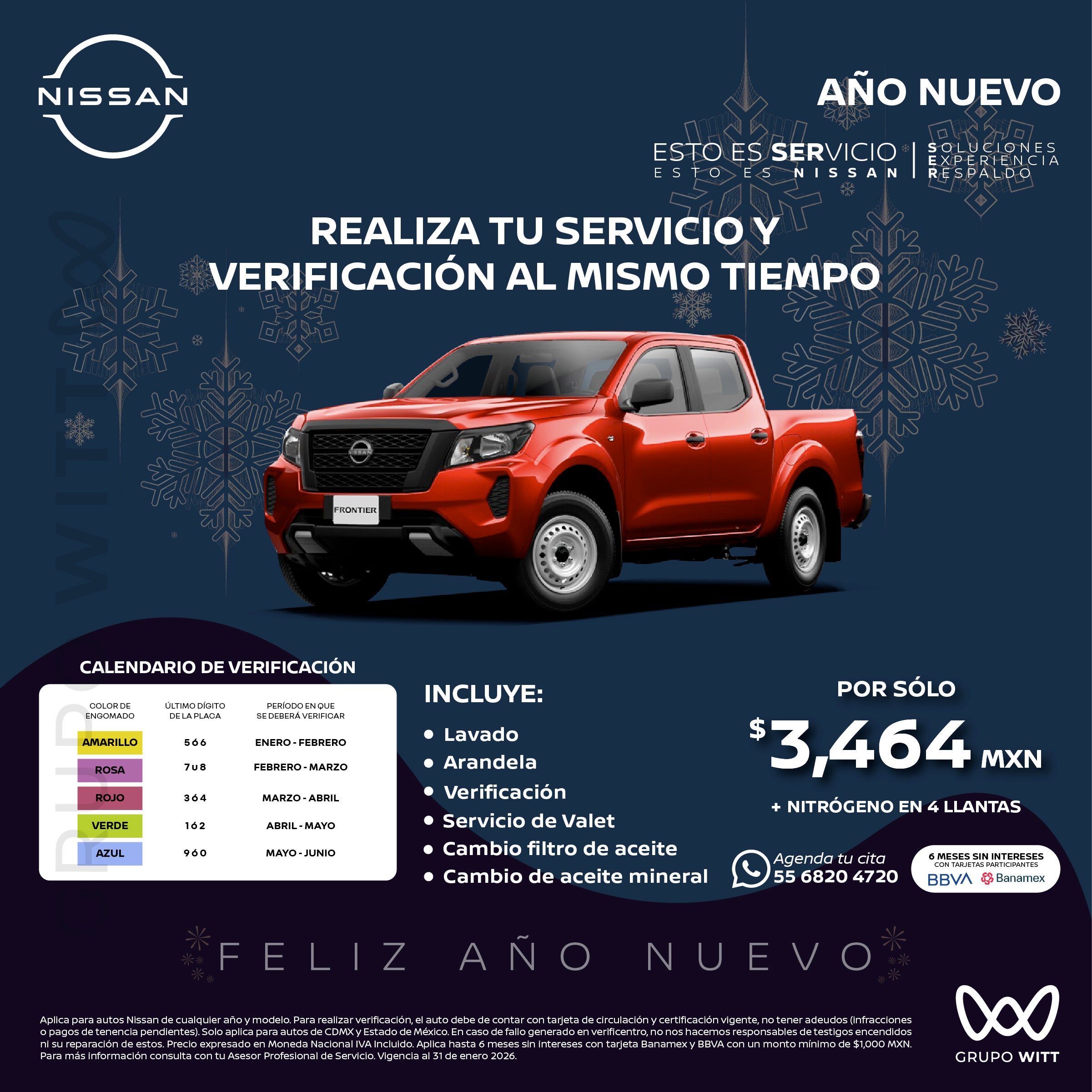 Aplica para autos Nissan de cualquier año y modelo. Para realizar verificación, el auto debe de contar con tarjeta de circulación y certificación vigente, no tener adeudos (infracciones o pagos de tenencia pendientes). Solo aplica para autos de CDMX y Estado de México. En caso de fallo generado en verificentro, no nos hacemos responsables de testigos encendidos ni su reparación de estos. Precio expresado en Moneda Nacional IVA Incluido. Aplica hasta 6 meses sin intereses con tarjeta Banamex y BBVA con un monto mínimo de $1,000 MXN. Para más información consulta con tu Asesor Profesional de Servicio. Vigencia al 31 de enero 2026.
