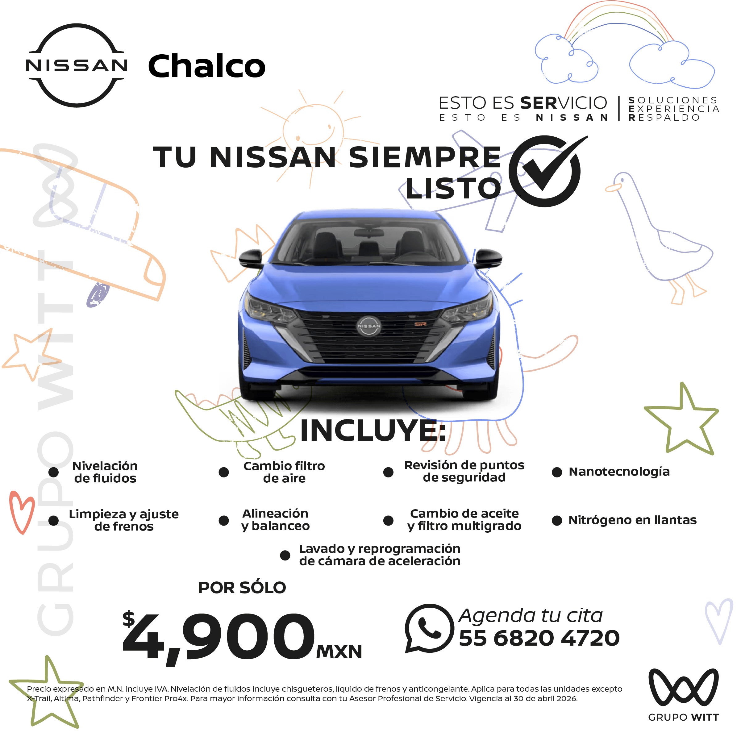 Precio expresado en M.N. incluye IVA. Nivelación de fluidos incluye chisgueteros, líquido de frenos y anticongelante. Aplica para todas las unidades excepto X-Trail, Altima, Pathfinder y Frontier Pro4x. Para mayor información consulta con tu Asesor Profesional de Servicio. Vigencia al 30 de abril 2026.