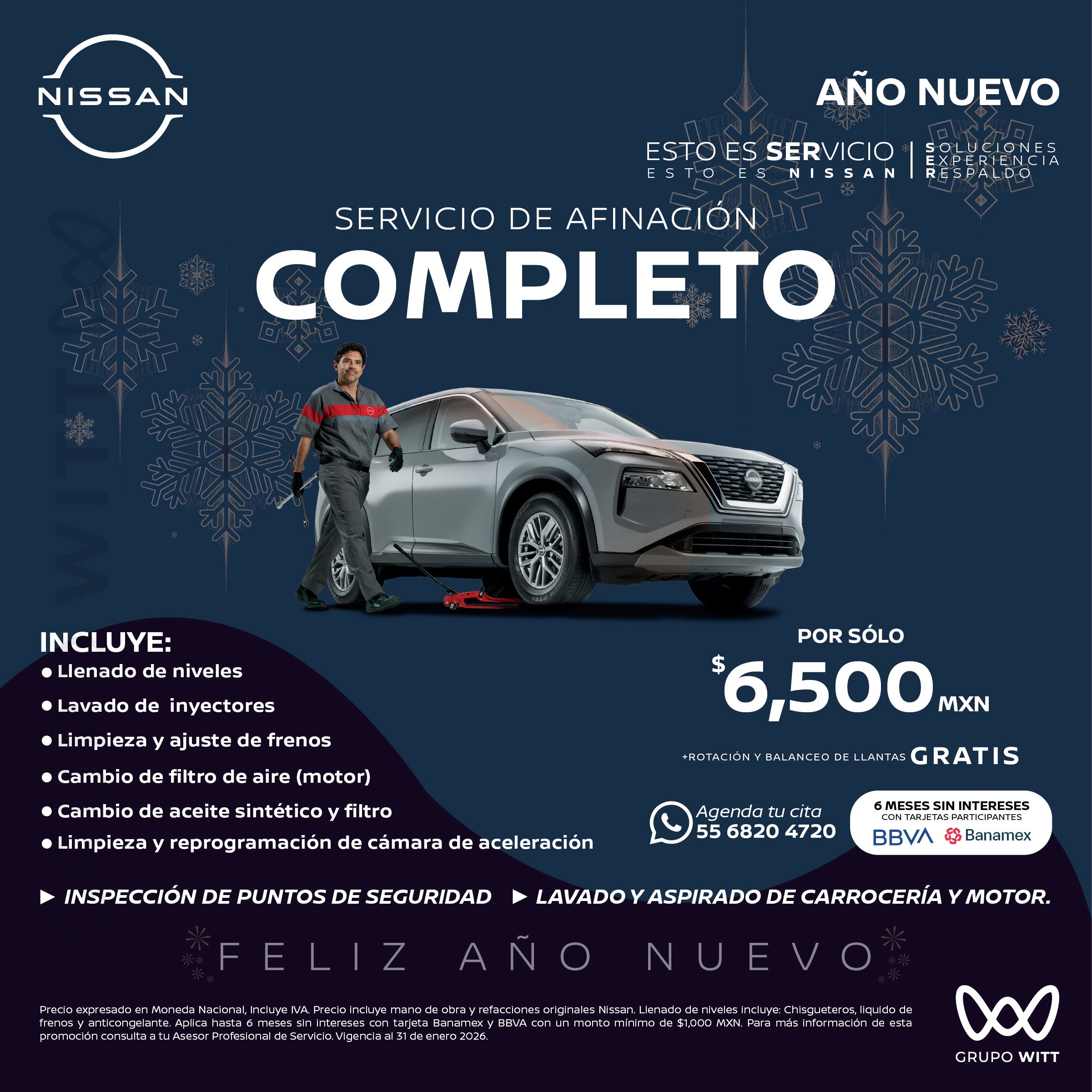 Precio expresado en Moneda Nacional, Incluye IVA. Precio incluye mano de obra y refacciones originales Nissan. Llenado de niveles incluye: Chisgueteros, líquido de frenos y anticongelante. Aplica hasta 6 meses sin intereses con tarjeta Banamex y BBVA con un monto mínimo de $1,000 MXN. Para más información de esta promoción consulta a tu Asesor Profesional de Servicio. Vigencia al 31 de enero 2026