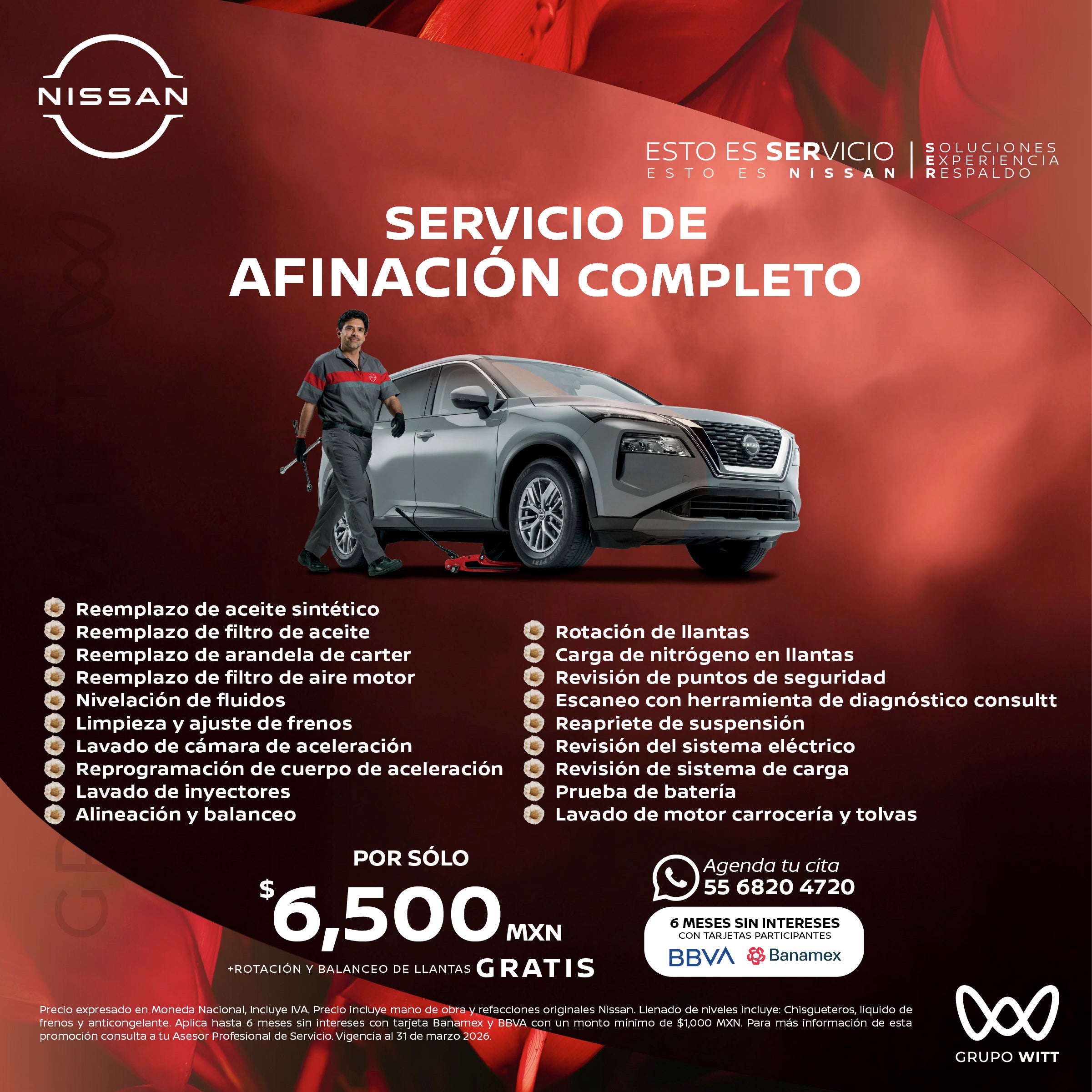 Precio expresado en Moneda Nacional, Incluye IVA. Precio incluye mano de obra y refacciones originales Nissan. Llenado de niveles incluye: Chisgueteros, líquido de frenos y anticongelante. Aplica hasta 6 meses sin intereses con tarjeta Banamex y BBVA con un monto mínimo de $1,000 MXN. Para más información de esta promoción consulta a tu Asesor Profesional de Servicio. Vigencia al 31 de marzo 2026.