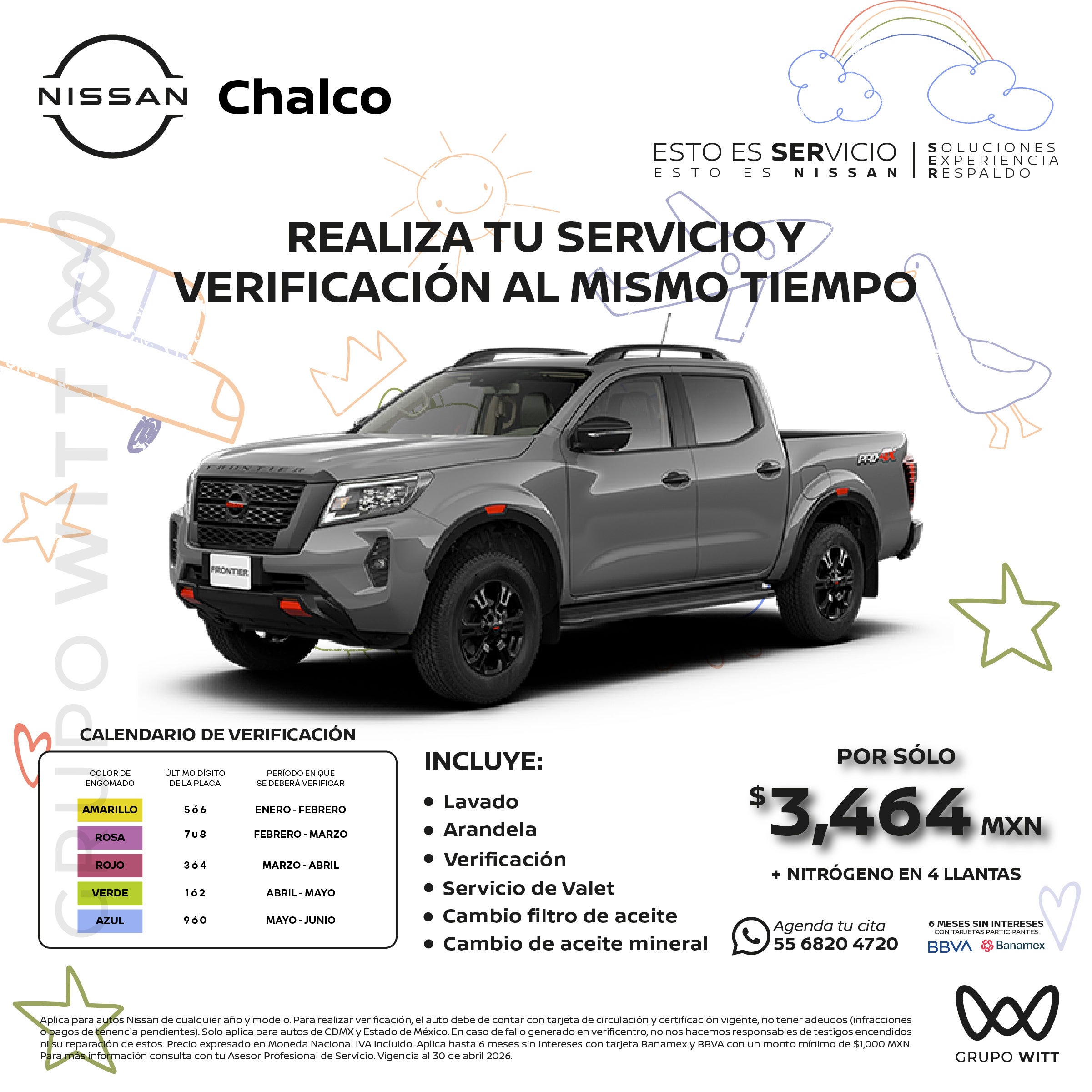 Aplica para autos Nissan de cualquier año y modelo. Para realizar verificación, el auto debe de contar con tarjeta de circulación y certificación vigente, no tener adeudos (infracciones pagos de tenencia pendientes). Solo aplica para autos de CDMX y Estado de México. En caso de fallo generado en verificentro, no nos hacemos responsables de testigos encendidos ni su reparación de estos. Precio expresado en Moneda Nacional IVA Incluido. Aplica hasta 6 meses sin intereses con tarjeta Banamex y BBVA con un monto mínimo de $1,000 MXN. Para más información consulta con tu Asesor Profesional de Servicio. Vigencia al 30 de abril 2026.