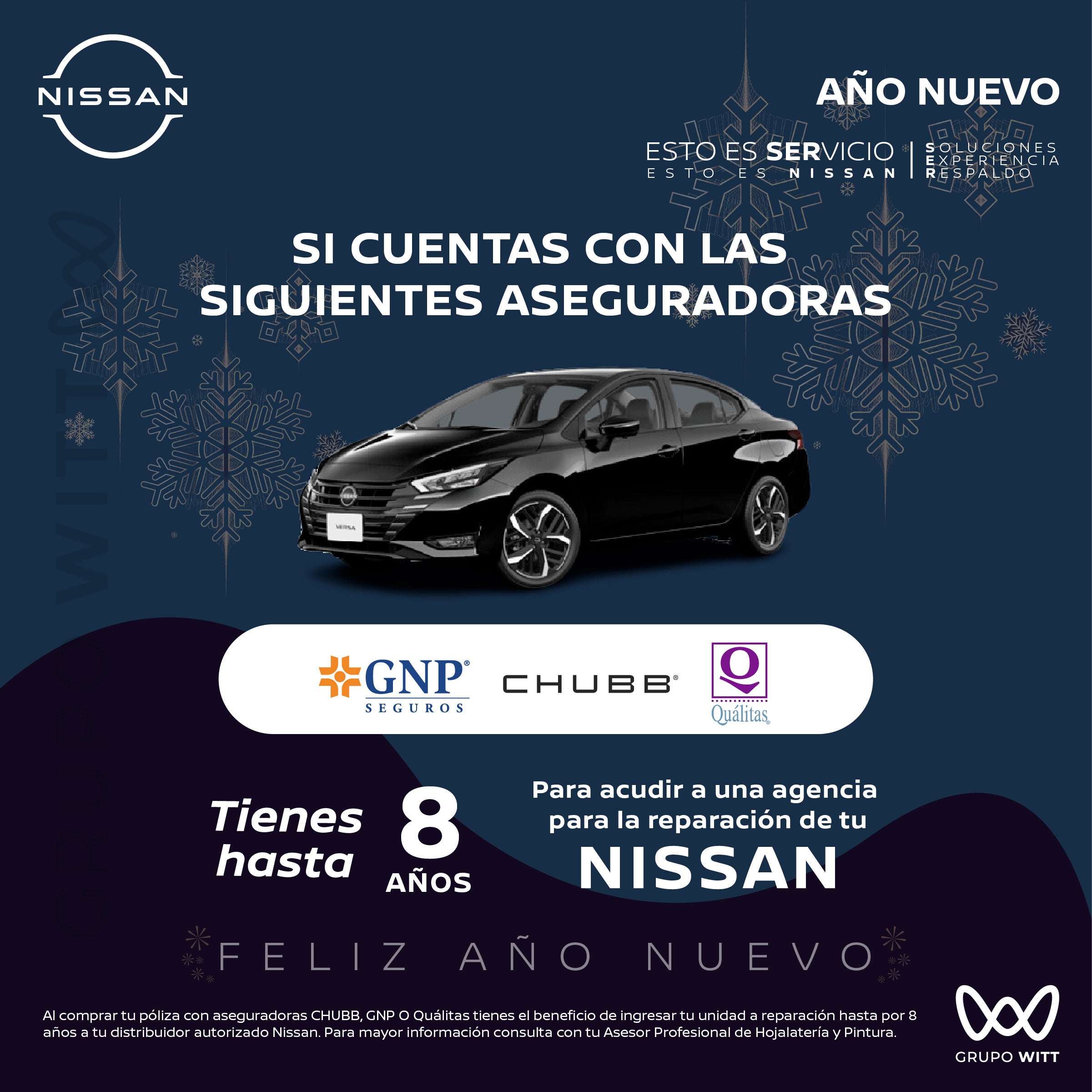 Al comprar tu poliza con aseguradoras CHUBB, GNP O Quálitas tienes el beneficio de ingresar tu unidad a reparación hasta por 8 años a tu distribuidor autorizado Nissan. Para mayor información consulta con tu Asesor Profesional de Hojalatería y Pintura.