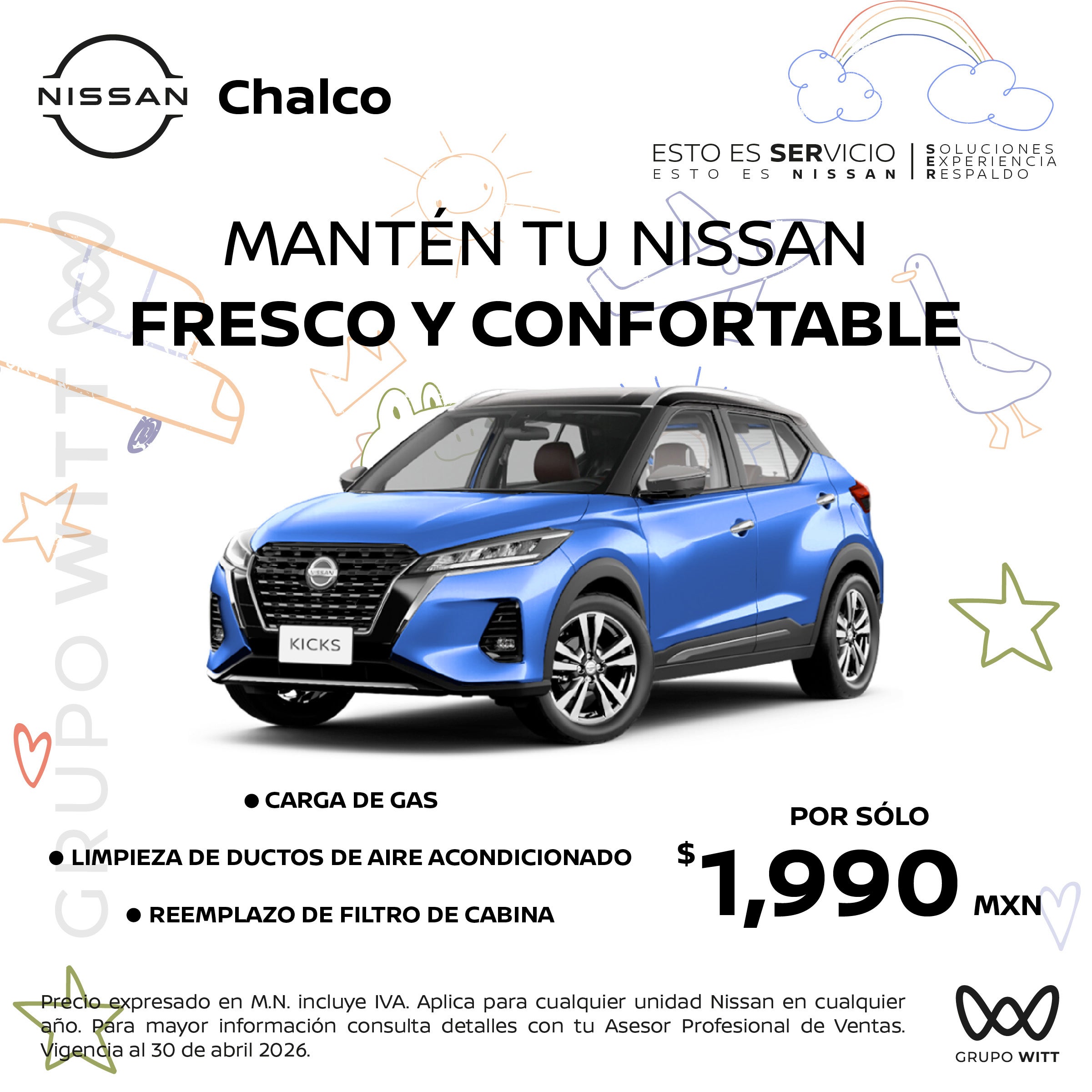 Precio expresado en M.N. incluye IVA. Aplica para cualquier unidad Nissan en cualquier año. Para mayor información consulta detalles con tu Asesor Profesional de Ventas. Vigencia al 30 de abril 2026.