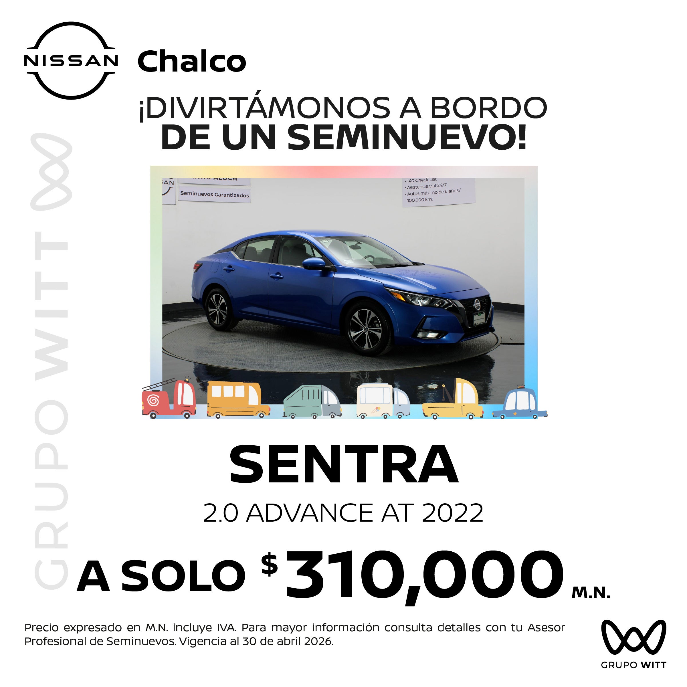 Precio expresado en M.N. incluye IVA. Para mayor información consulta detalles con tu Asesor Profesional de Seminuevos. Vigencia al 30 de abril 2026.