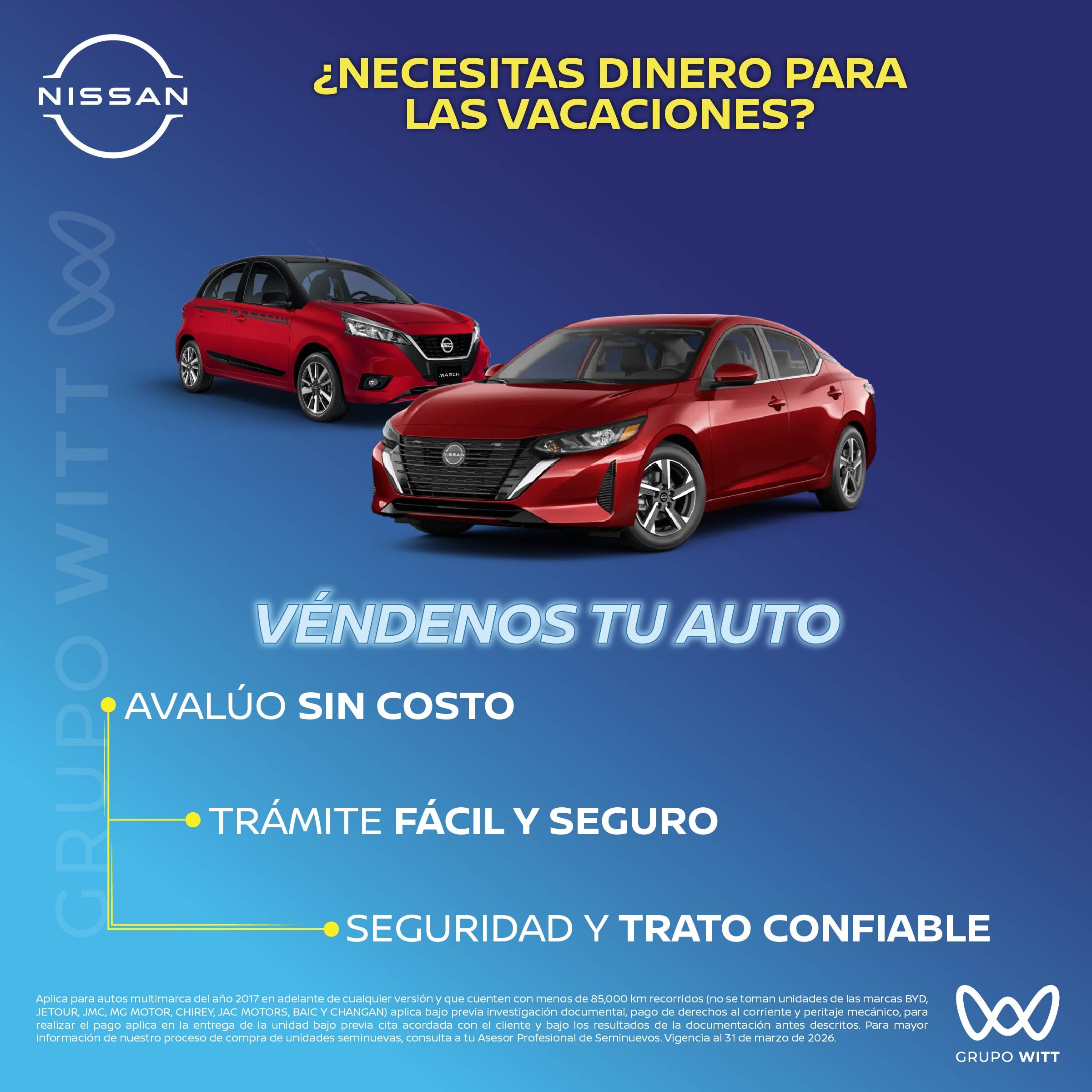 Aplica para autos multimarca del año 2017 en adelante de cualquier versión y que cuenten con menos de 85,000 km recorridos (no se toman unidades de las marcas BYD, JETOUR, JMC, MG MOTOR, CHIREY, JAC MOTORS, BAIC Y CHANGAN) aplica bajo previa investigación documental, pago de derechos al corriente y peritaje mecánico, para realizar el pago aplica en la entrega de la unidad bajo previa cita acordada con el cliente y bajo los resultados de la documentación antes descritos. Para mayor información de nuestro proceso de compra de unidades seminuevas, consulta a tu Asesor Profesional de Seminuevos. Vigencia al 31 de marzo de 2026.